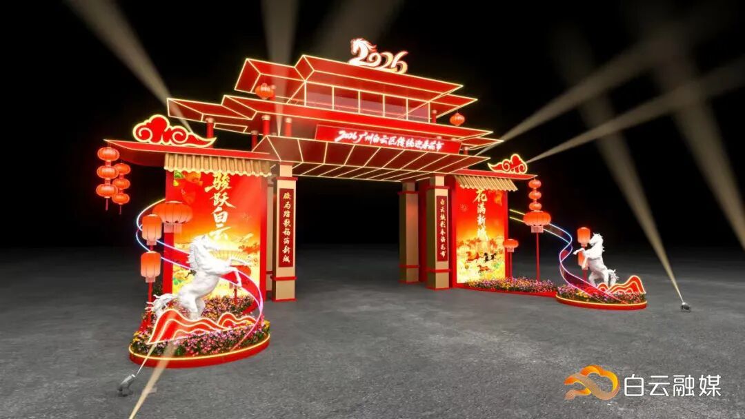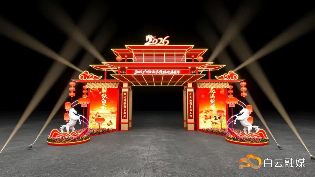 白云新城作为2026年APEC第一次高官会的重要场地,见证了白云乃至广州的国际交往风采。本次白云花市牌楼设计,精准萃取白云国际会堂标志性的层叠飞檐元素,搭配朱红斗拱与鎏金灯带,既有广府传统建筑的雅致底蕴,又兼具现代地标建筑的大气质感。还特邀文学大师融合白云特色、马年元素与传统文化,量身打造牌楼对联、并亲自挥毫题写,为牌楼增添墨香雅韵。