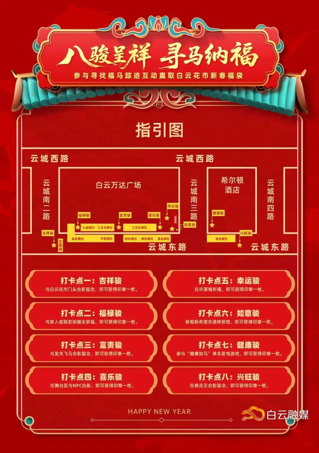 白云花市现场共设“八骏呈祥 寻马纳福”八大打卡点,市民免费领取寻骏图,逛花市时在打卡点完成任务并收集印章,集齐“八骏”即可兑换由新希望乳业公司提供的2026份新年限量礼品。